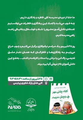 همگام با شرکتها و یاوران عزیزمان در شهر علم و فناوری پردیس، امسال نیز در مراسمی بزرگتر از سالهای پیش، چوب حراج میزنیم به یادگاریها و خاطراتمان که همان دفتر مشقهای قدیمی، پاککن، تراش، کارنامه، عکسهای دوران دانشآموزی، کتابهای قدیمی و … است، تا از فروش آنها سهمی داشته باشیم در کمپین 🎒کولهپشتی مهر ➕ روپوش مدرسه🎒