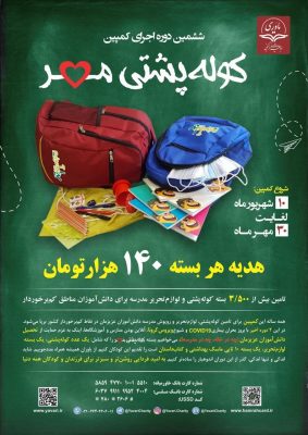 در این ۲ دوره اخیر با بروز بحران بیماری COVID19 و شیوع ویروس کرونا، آنلاین بودن مدارس و آموزشگاهها، اینک به عزم حمایت از تحصیل دانشآموزان عزیزمان (چه در خانه، چه در مدرسه)، میخواهیم بسته کولهپشتی مهر را که شامل: یک عدد کولهپشتی، یک بسته لوازمتحریر، یک بسته ۱۰ تایی ماسک بهداشتی و کتابداستان است را تقدیم این کودکان کنیم. از یاوران همیشه همراه مددجوییم شاید اندکی و تنها اندکی، گذر از این دوران اندوهبار را سادهتر کنیم.